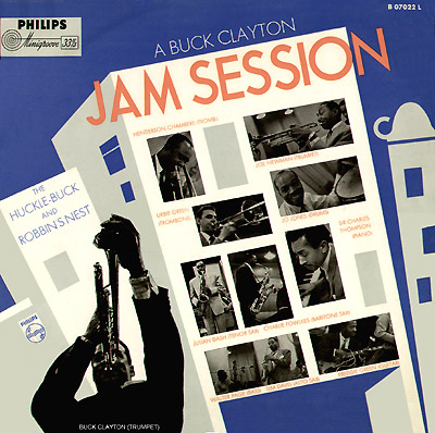 a trumpet, the suggestion of the New York skyline in black, plus the lettering