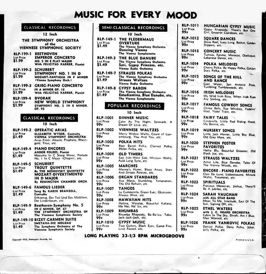 MUSIC FOR EVERY MOOD was the headline on the back of the first covers of the Remington Lp-releases of 1950. The price was reflected in the reference number: RLP-199 meant $1.99 for a 12" record, RLP-149 indicated the price of $1.49 for a 10" record. The 1000-series was of popular music on 10" discs. This price policy was soon abandoned.